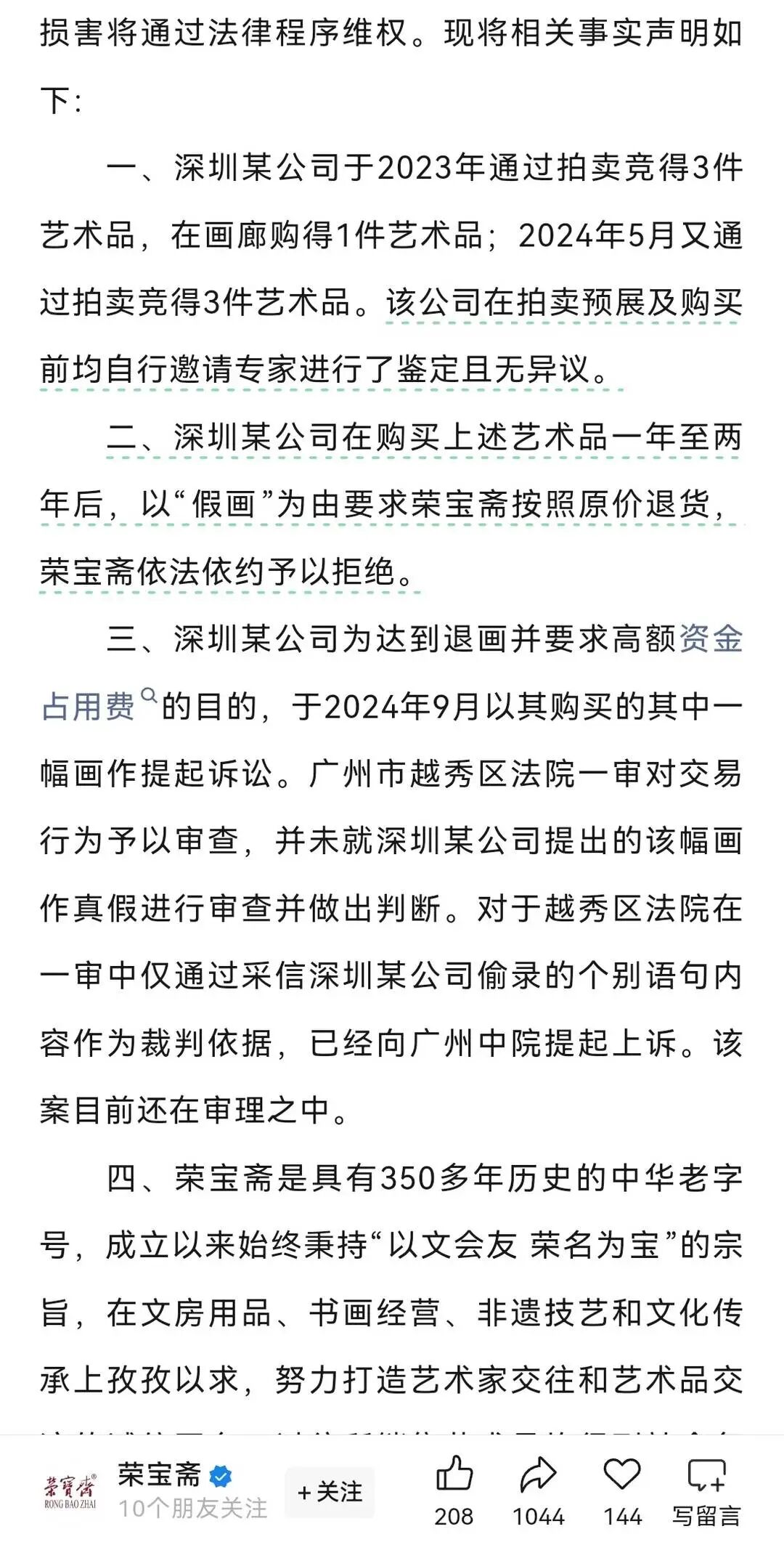 声明称,深圳爱圣公司2023年通过拍卖和画廊购买4件艺术品,2024年5月通过拍卖获得3件艺术品,在拍卖预展及购买前均自行请专家进行了鉴定且无异议;爱圣公司在一至两年后以“假画”为由要求原价退货,被荣宝斋拒绝;爱圣公司为达到退画目的并要求高额资金占用费,2024年9月以其中一幅画起诉,广州越秀区法院一审对交易行为予以审查,但未对画作真假进行审查和判断;越秀区法院仅通过采信爱圣公司偷录的个别语句作为裁判依据,荣宝斋已向广州中院提起上诉。